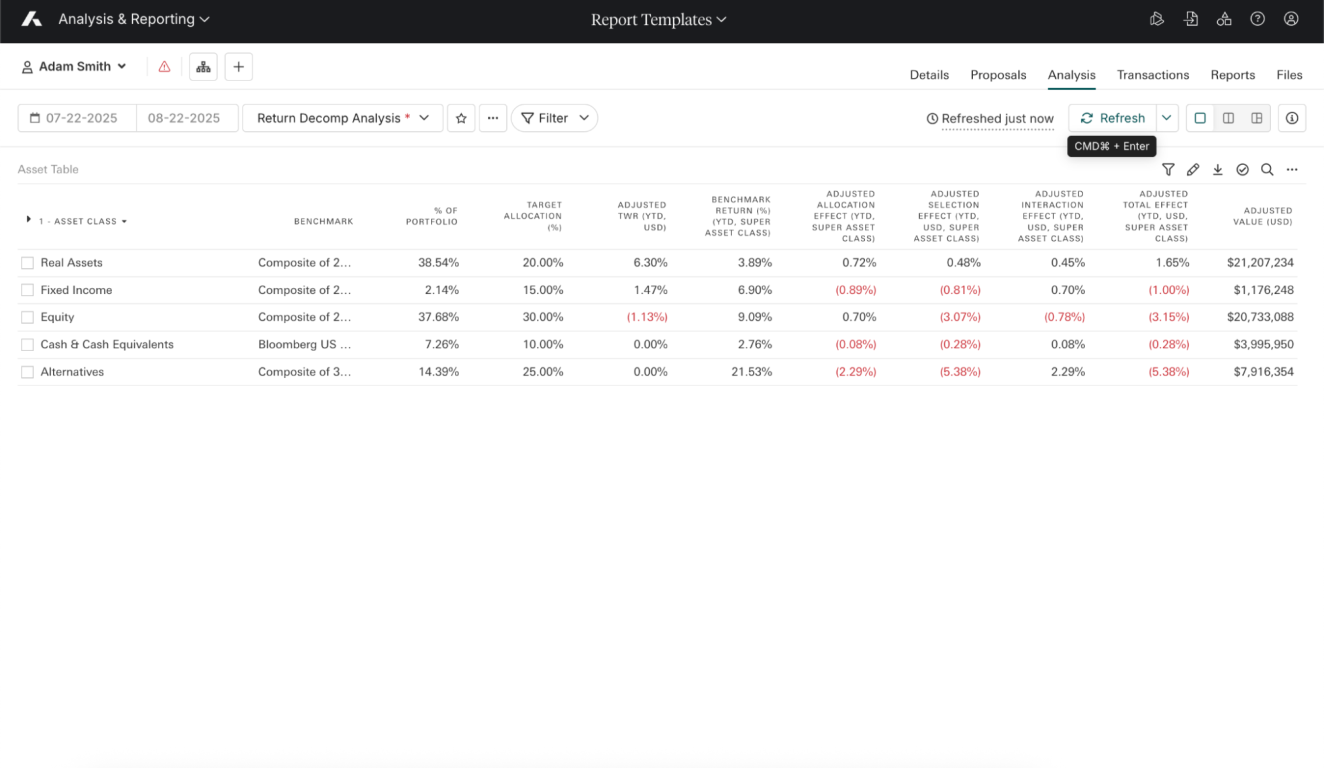 Go beyond simple returns to understand the true drivers of performance. With Return Decomposition, you can quantify the impact of your allocation and selection decisions relative to your target strategy. Build a compelling client narrative, pinpoint areas for refinement, and automate attribution calculations across Dashboards, Reporting, Analysis, and the Client Portal.