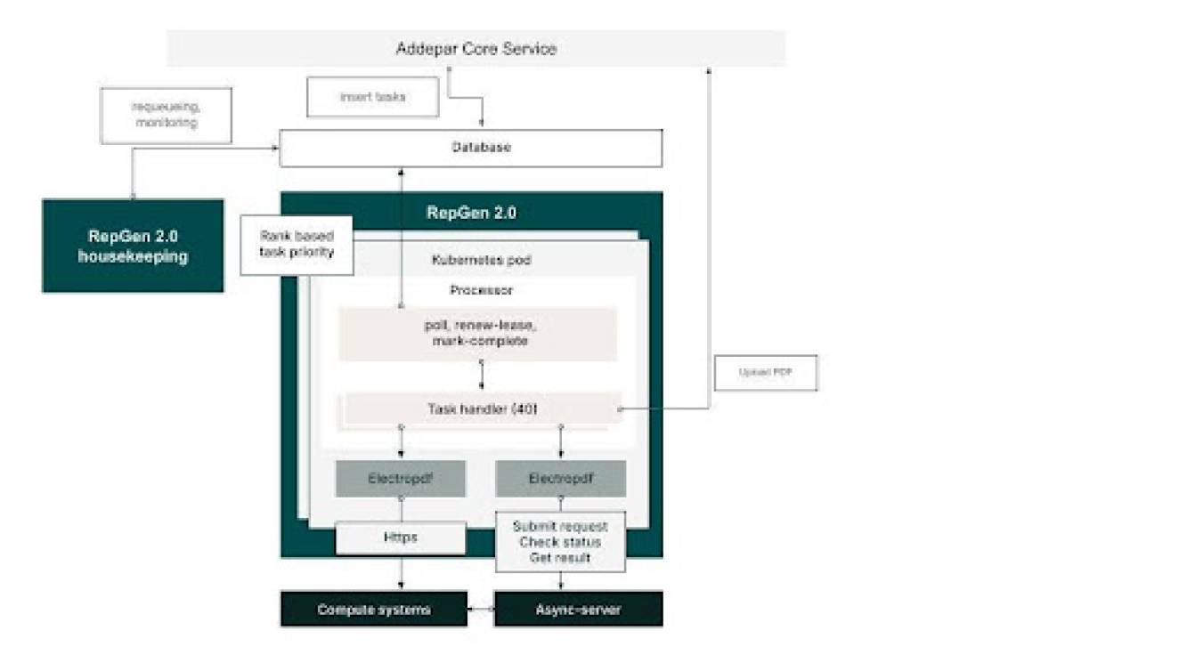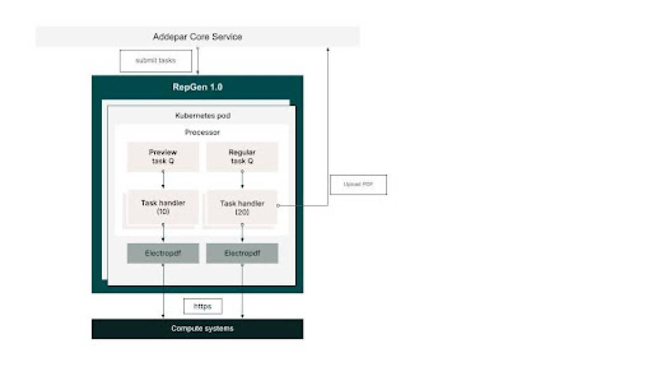 • A set of processors to which reporting tasks (PDFs to be generated) were pushed over https calls (by Addepar Core Service)