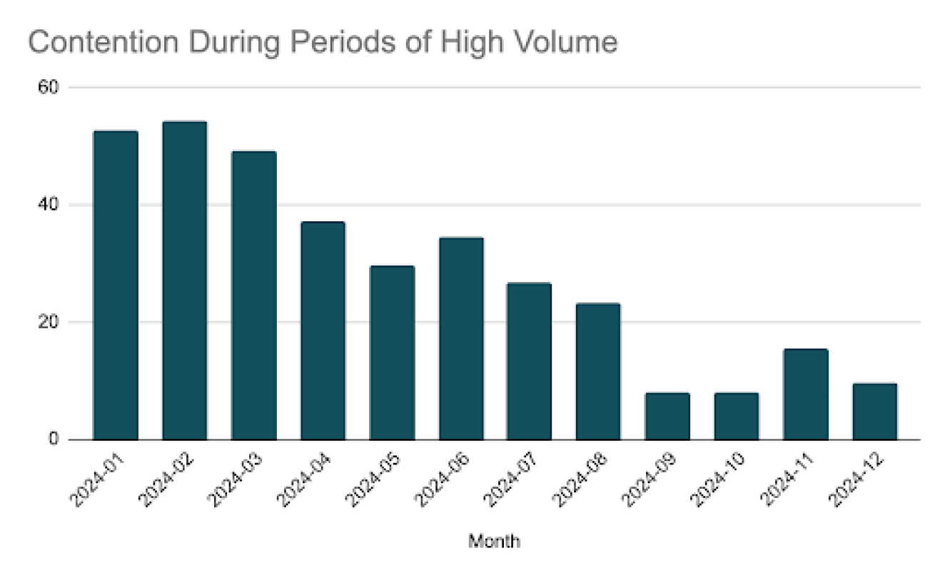 While the system was able to scale to support the increased demands, we also improved our monitoring to evaluate the amount of contention that our clients experience for report generation resources. During normal business days, the increased capacity and improved load balancing of the new system allowed for minimum contention. During periods of high demand, such as monthly/quarterly reporting cycles, firms would experience contention, and therefore delays. We used this data to tune our system over the course of 2024, reducing the amount of contention during these worst-case scenarios from ~45% to <10%.
