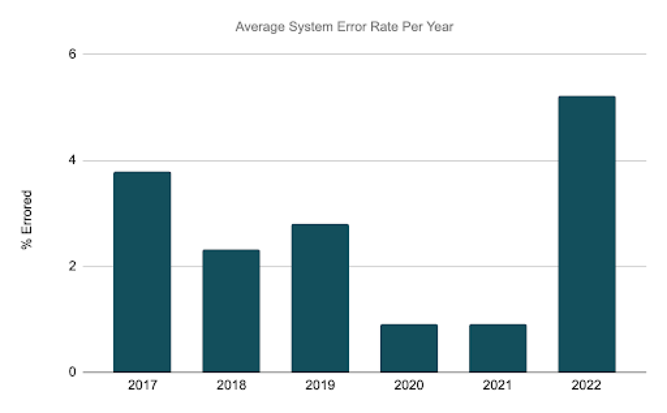 As you can see below, the error rate peaked in 2022 as the increased volume weighed on the previous generation’s system.