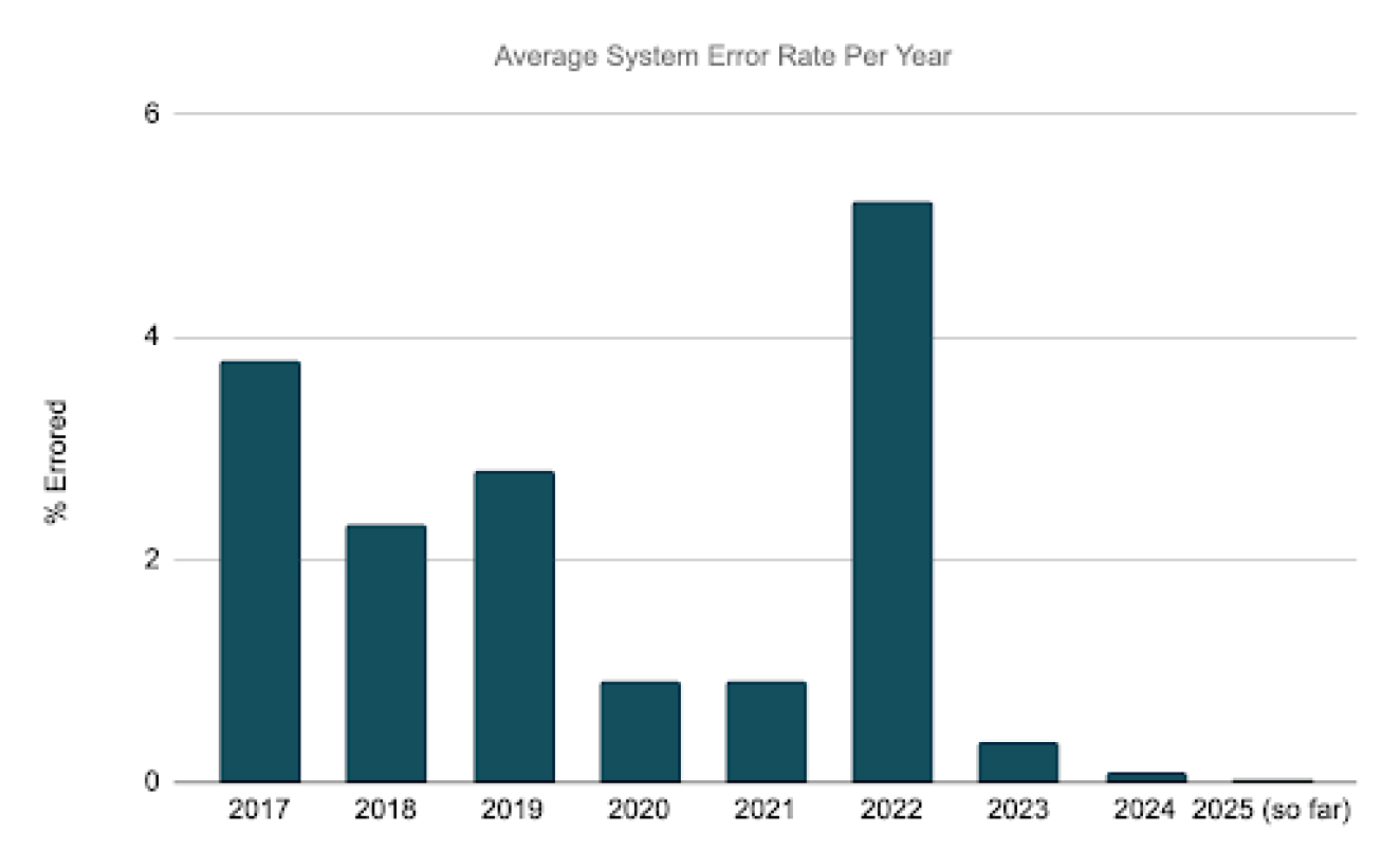 While the new system supported the demand growth, it also brought improvements in fundamental reliability, recoverability, error detection, error classification and automatic retries — all of which made an immediate and dramatic improvement on the error rates. These functions have been fine tuned over time allowing us to continually reduce the system error rates. The 2025 error rate is ~100x less than the 2017 error rate and 130x less than the 2022 error rate.