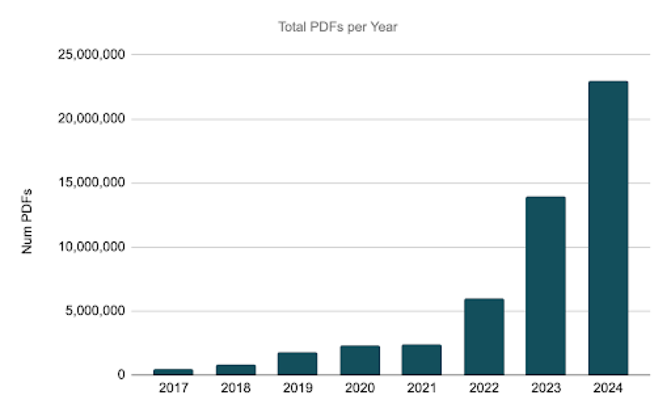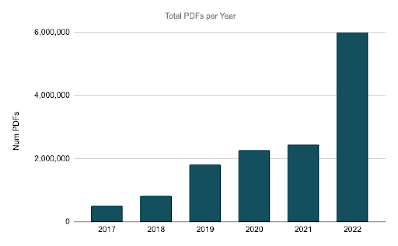 Over the 6-year period from 2017-2022, the number of PDF reports generated had been averaging an increase of ~85% each year - with the exception of 2020-2021. The volume increased from 500K in 2017 to 6M in 2022 — which is a 12x increase over the course of 6 years.